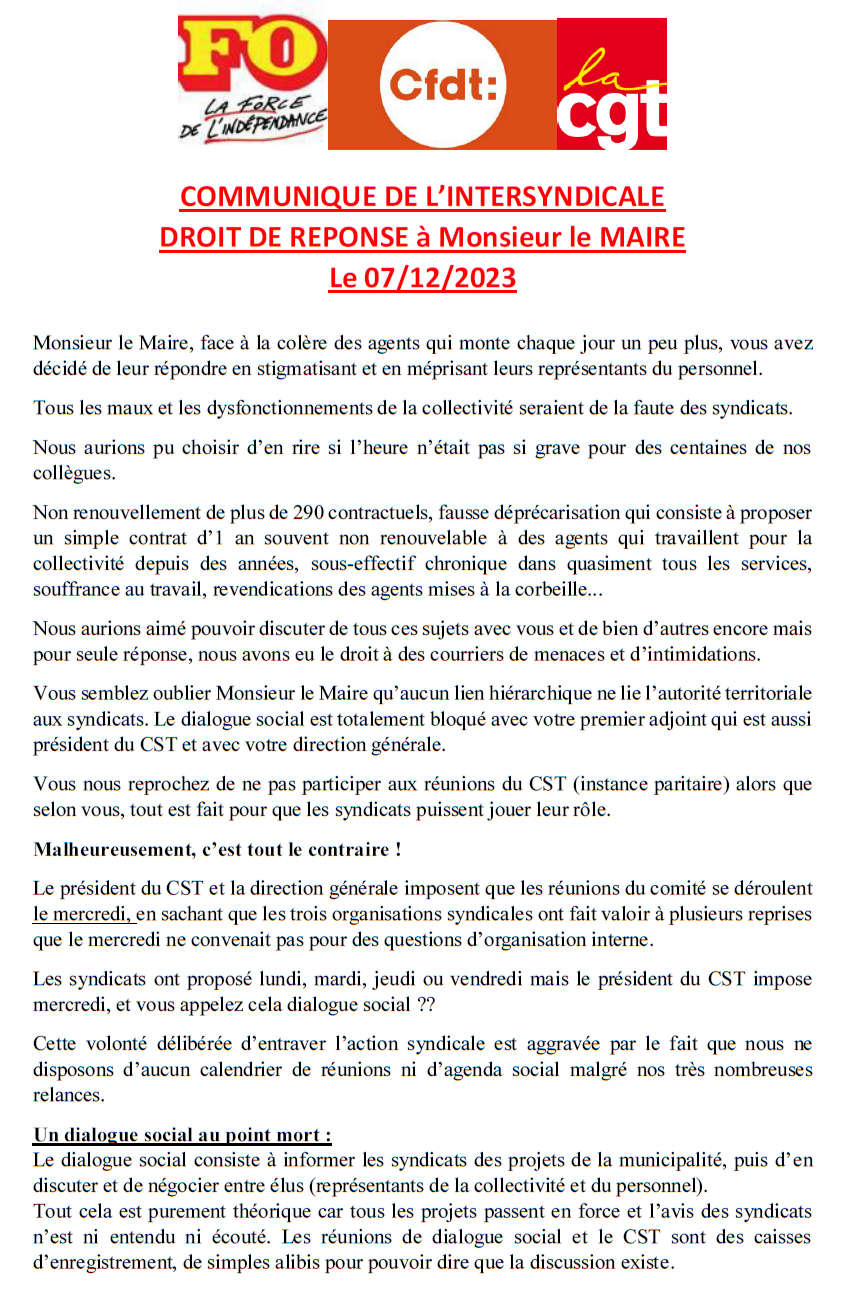 Un véritable dialogue social sincère doit exister entre les agents communaux, l'administration et les élus pour que le service rendu à la population soit le meilleur.